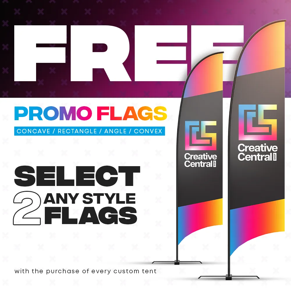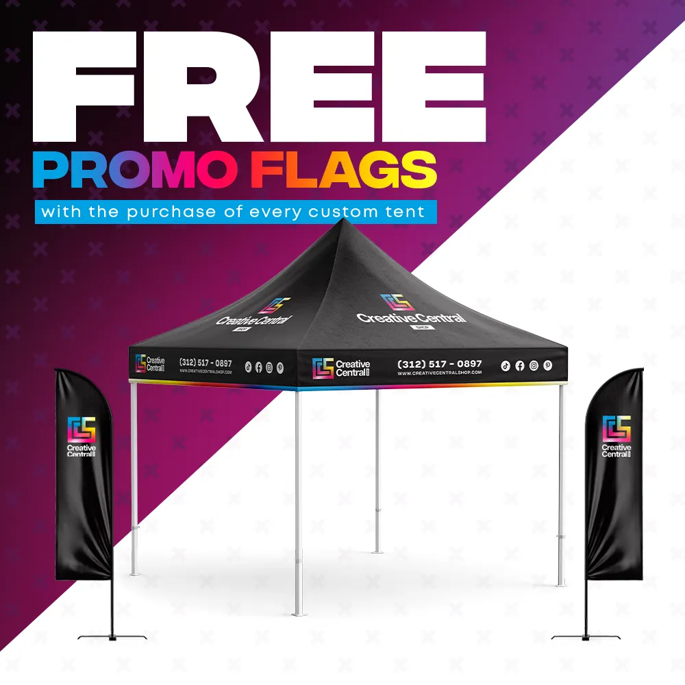 Get a premium 10x10 custom canopy tent with frame, printed top, roller bag, PLUS two 9ft double-sided flags with cross bases everything you need to stand out.
